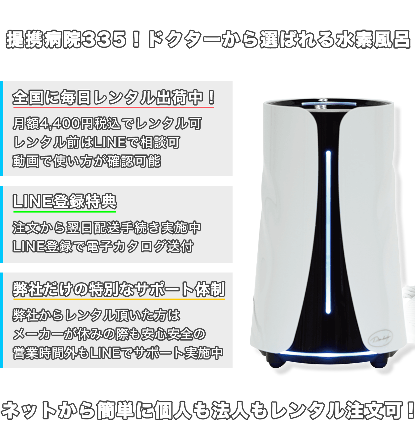 水素風呂の効果を期待したい方にこそ、リタライフはイチ押しです!また、他の水素風呂にはないのがレンタルできることです。今、水素の研究が盛んに行われていますが、未常識の水素ですから、数万円の高いお金を払って試すというのはハードルが高いと言わざるを得ません。水素風呂リタライフは月額4,400円(税込)でレンタルができるので、試しやすい点も多くの方から選ばれているヒミツです♪