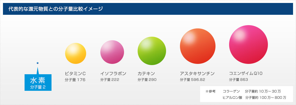 一方、水素は現在の科学では宇宙一小さな原子と定義されており、また両親性という特質をもち水でも脂でもないので人間の奥深くまで入り込んで脳にまで入っていくことができます。他の抗酸化物質は還元力は高いものの、悪玉活性酸素であるヒドロキシルラジカルが存在する領域に到達できないため、そこに到達できることが水素の唯一無二にして最大のメリットといえるでしょう。