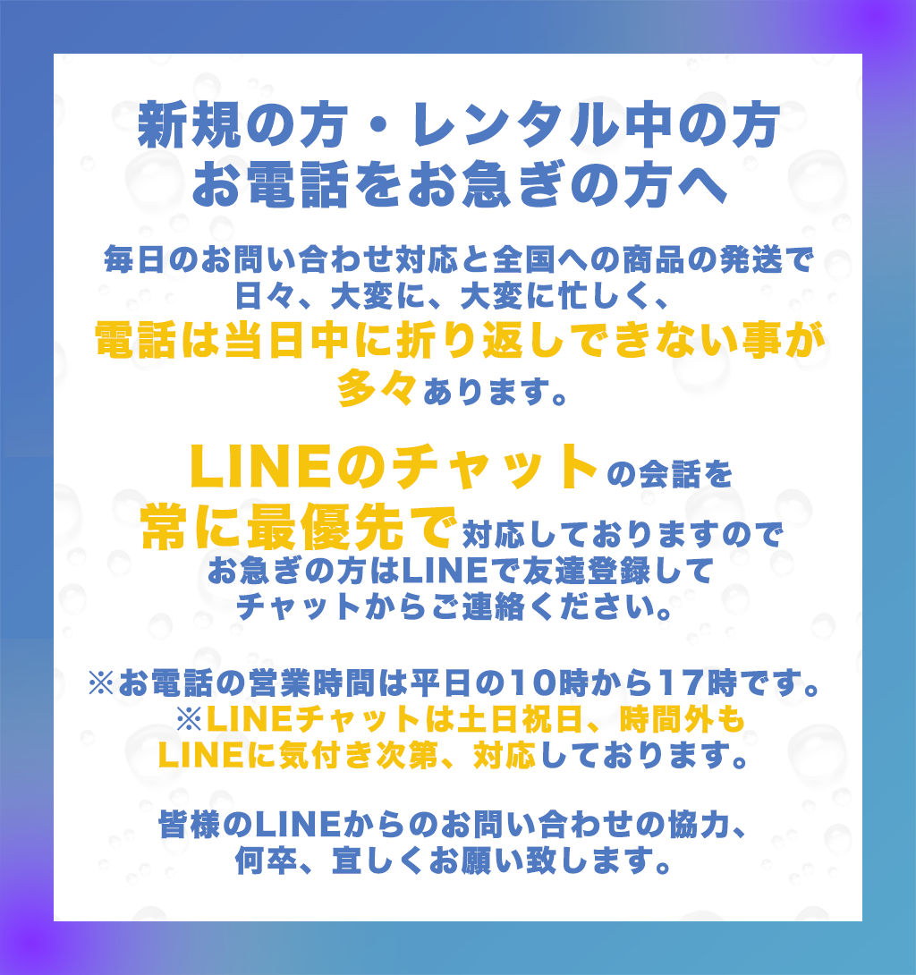 ご予算のない人もふくめ、一人でも多くの人に水素商品をご利用頂くため、レンタルという方法にこだわりをもって10年以上取りくんで参りました。