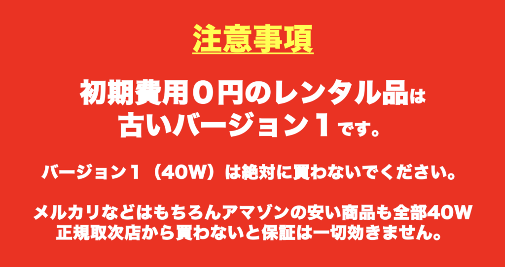 ※初期費用0円とPRし、40Wでレンタルを出しているリタハートインターナショナル株式会社を通さないリタライフのレンタル業者がおりますが、それは古い型の出力半分のバージョン1となりますのでお気ををつけください。 |