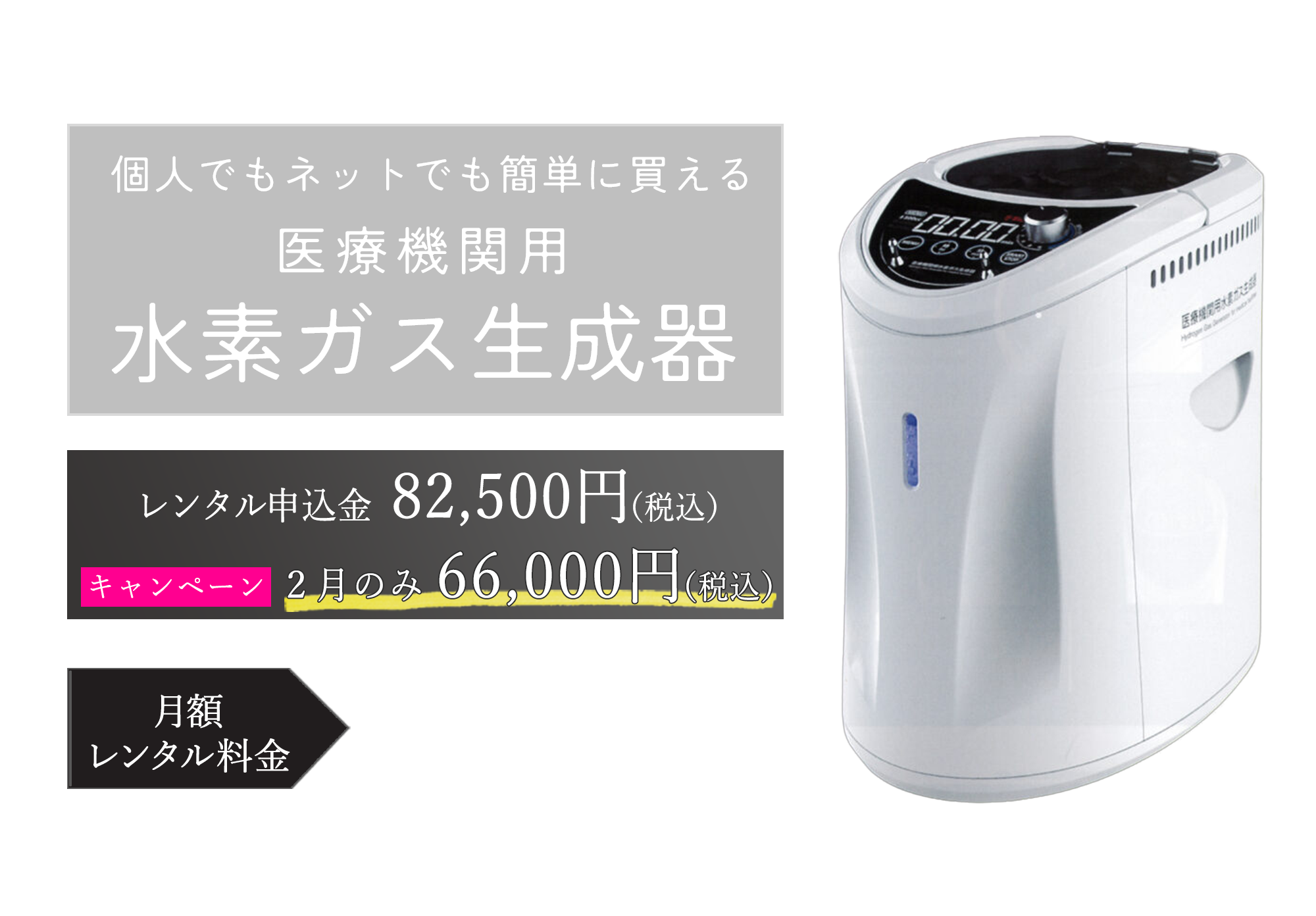 ご予算のない人もふくめ、一人でも多くの人に水素商品をご利用頂くため、レンタルという方法にこだわりをもって10年以上取りくんで参りました。